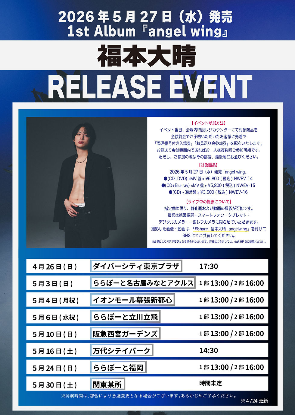 福本大晴 1st Album『angel wing』リリースイベント 5/24(日) ららぽーと福岡